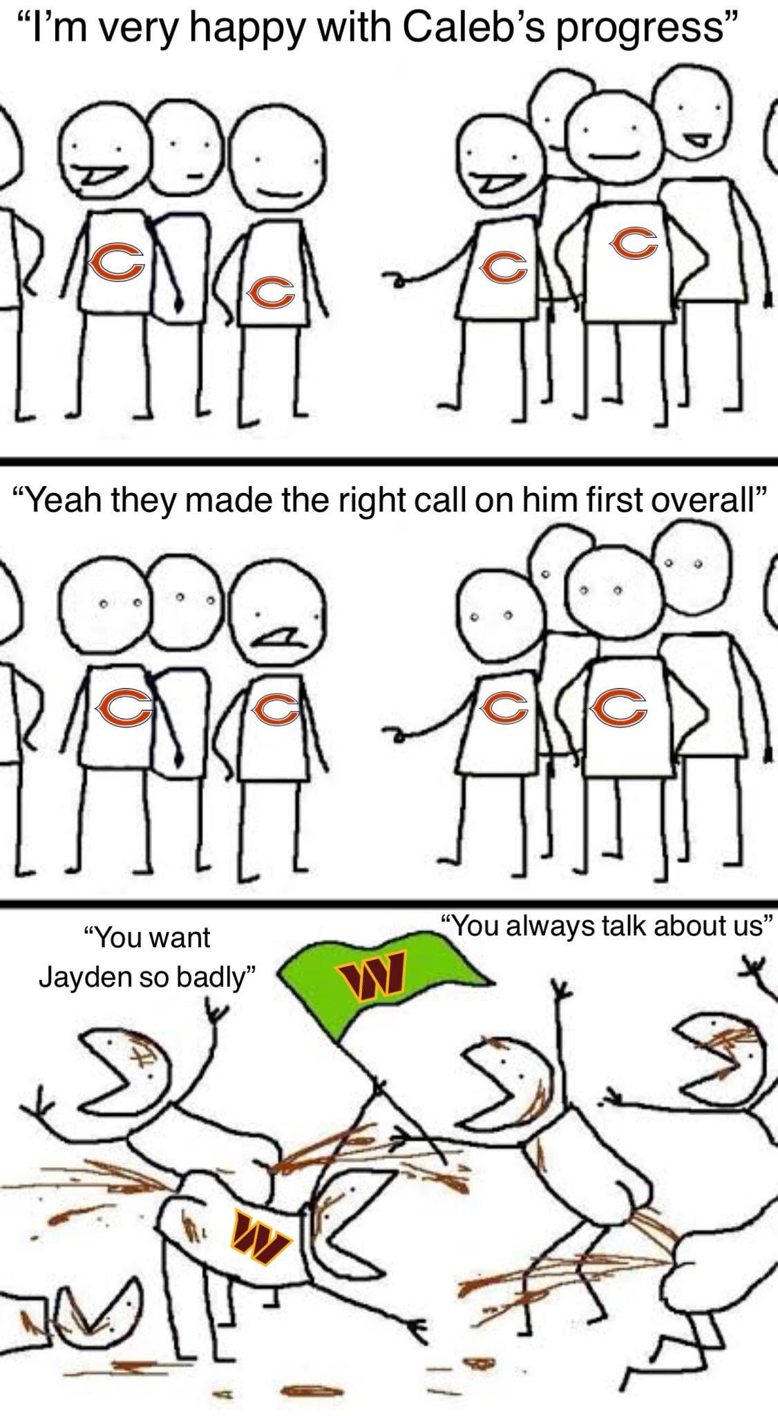 11. From my experience as a Bears fan in the DMV, most of the Commanders fans I know do realize that Jayden would have also had a horrible rookie season last year with that horrible line and coaching staff.