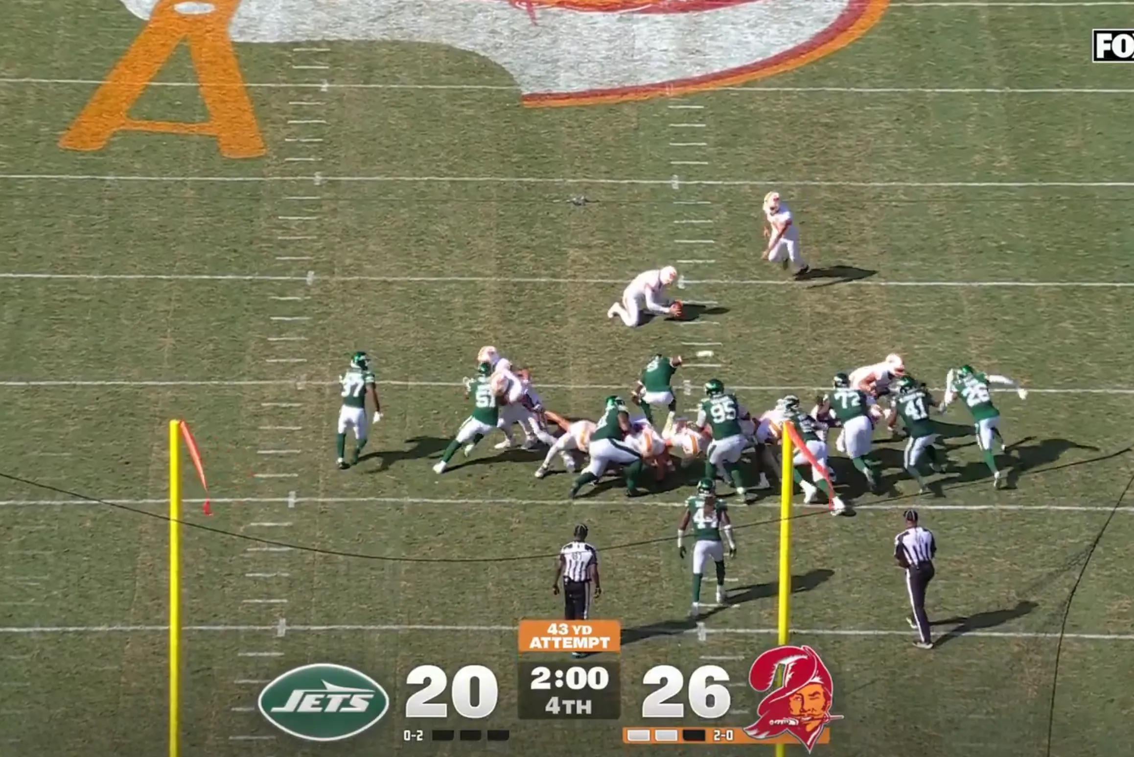 I was very confused, vividly remembering this blocked field goal attempt returned for a touchdown. (Absolutely iconic celebration from Aaron Glenn — I couldn't even be mad as it was happening when they showed him.)