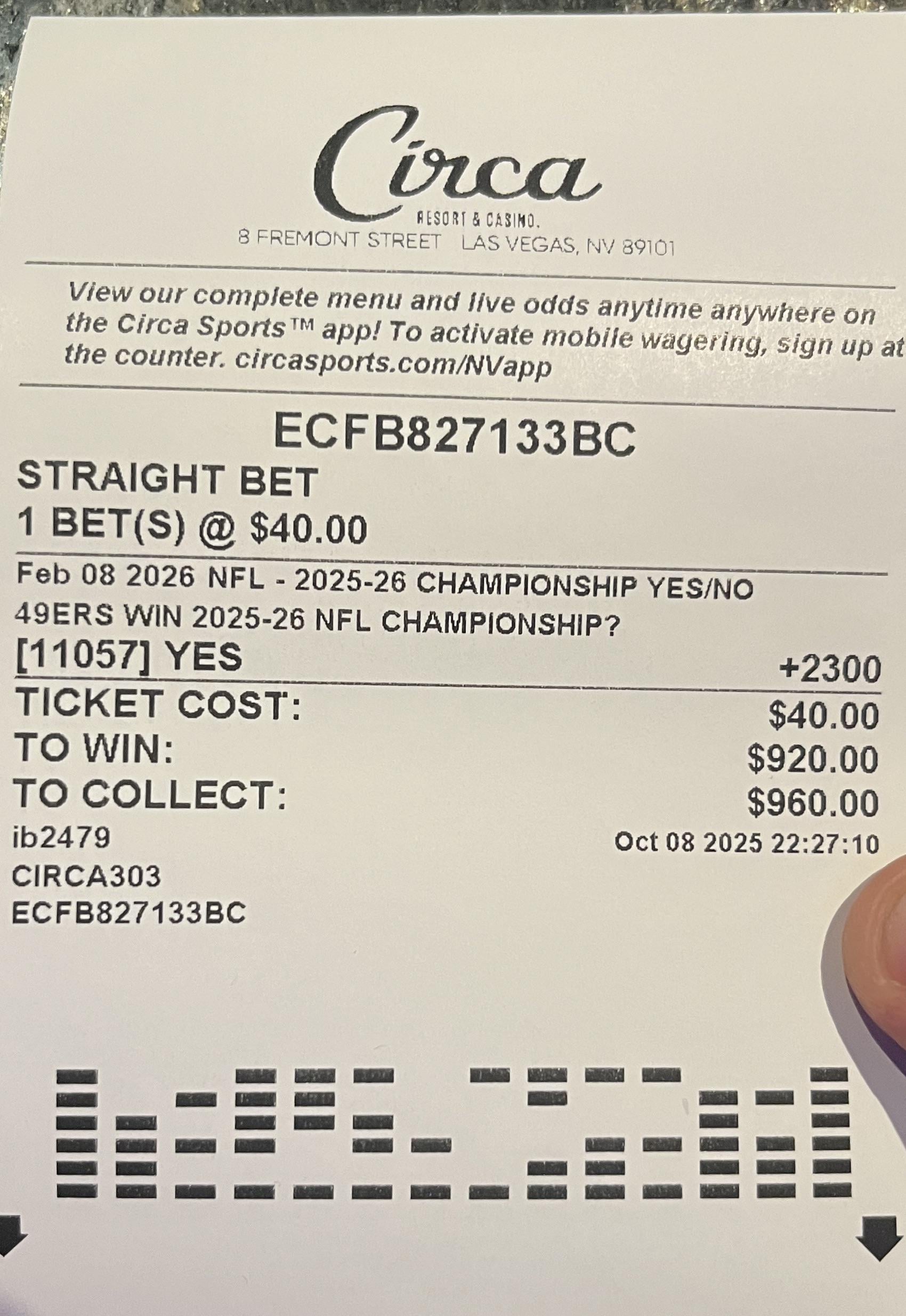 Nice. When I go to Vegas I just do straight bets on things I want to happen or feel like its a good time. I take $200 to lose. I won every single bet and my friends bets. I was 10/10 on bets. The best part of Vegas is hotel bars and drinking 32 Oz labatt’s at 10 in the morning with all those crazy football fans all decked out. As far as foot all fan commraderie I reckon theres nothing better. I did meet a fellow 49er fan that bet 88,000 on 12 leg parlay and told me they were gonna lose their house. They hit 11. That was insane. I still dont understand gambling addicts all the way.