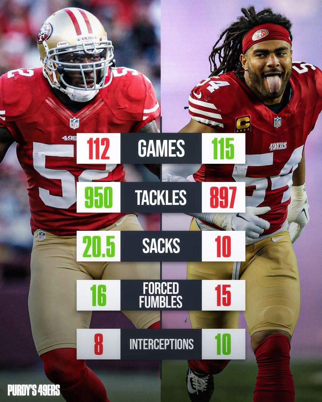 They’re different players, in slightly different eras, asked to do different things. It’s a great debate at this point. If Fred stays healthy, there won’t be a debate that doesn’t have to include “in their prime” because his longevity will win out in my opinion. Right now I’m still pushing Pat hard. Dude was in talks of being one of the best middles of all time, not just in 49ers history.
