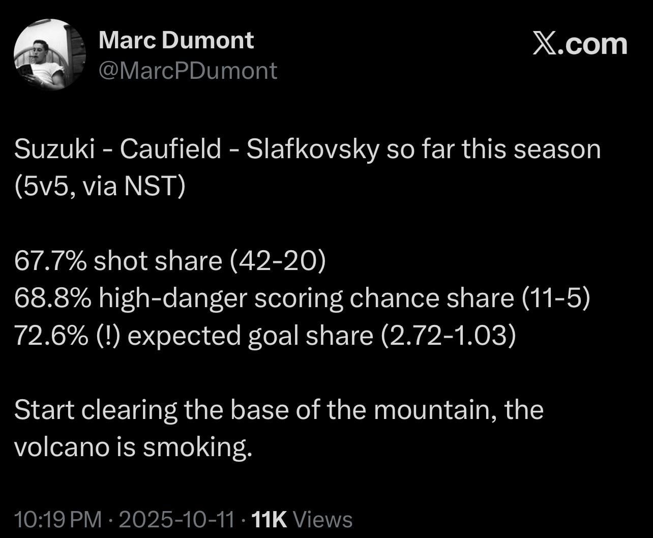 5. 67.7% shot share is actually wild considering we’ve been on the road for all 3 games. Every coach had the chance to match them how they want and they still outplayed whoever they had to by a wideee margin.