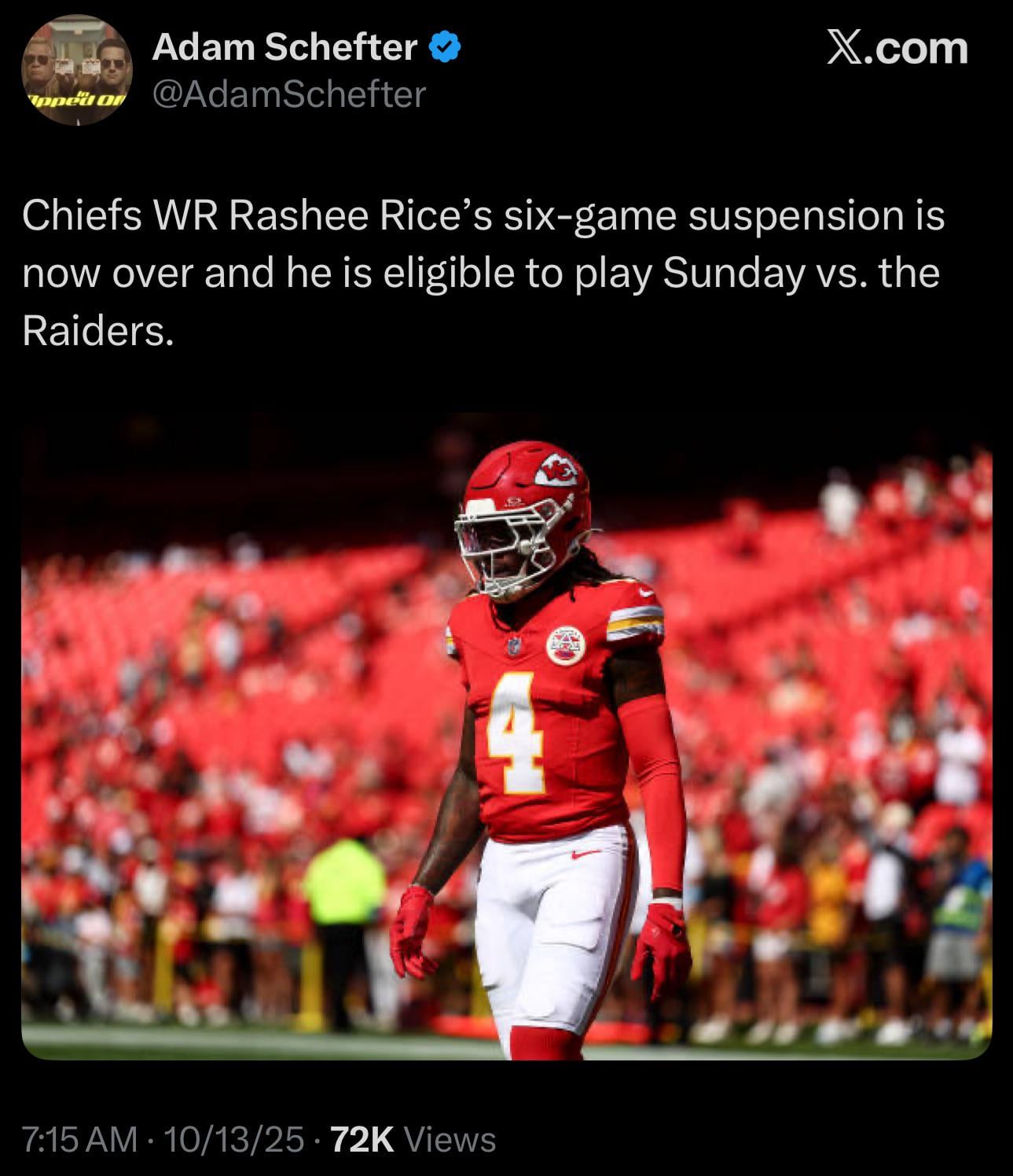 [Schefter] Chiefs WR Rashee Rice’s six-game suspension is now over and he is eligible to play Sunday vs. the Raiders.