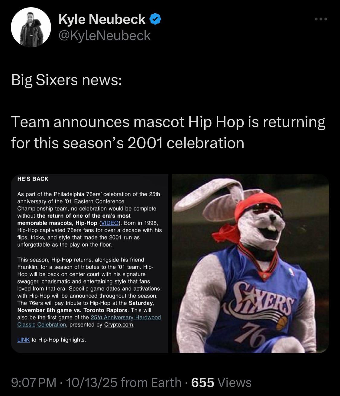 >As part of the Philadelphia 76ers’ celebration of the 25th anniversary of the ‘01 Eastern Conference Championship team, no celebration would be complete without the return of one of the era’s most memorable mascots, Hip-Hop (VIDEO). Born in 1998, Hip-Hop captivated 76ers fans for over a decade with his flips, tricks, and style that made the 2001 run as unforgettable as the play on the floor.