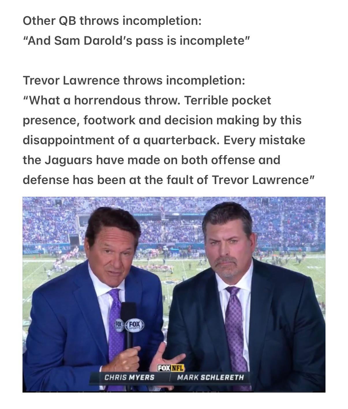 This is just a dumb meme about the commentators, I’m not saying Trevor doesn’t have a couple bad overthrows in each game (I’ll still defend him to the death). Thought it was funny that they blamed some OL penalties on him and don’t seem to shred any other QB this hard, other than Caleb Williams