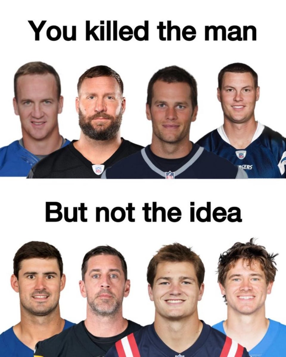 What Year Is It 😭 33 comments  I think we stumbled into a….. Aaron even pump faked for the TD pass to DK 😭 I was like Ben is that you  I feel like I’m just watching the Temu version of the 2007 season, and I’m completely okay with it By “idea” do you mean white qb? Peyton looks sinister as hell lmao. The absolute legendary QB play we got to grow up watching in this league before they crippled defenses too. Historic. One of these is not like the other. Top row it’s Rivers, bottom row it’s Rodgers lol Justin Herbert got some work to do with Madison Beer to catch Philip Rivers though. It’s still weird seeing Rodgers in a Steelers jersey My god manning certainly had a forehead on him Daniel Jones looks either deranged or brain damaged Rodgers is one year younger than Ben. One of these is not like the others I was thinking about this too when I saw the standings. We used to watch gods play quarterback man Man Rodgers pic looks like a mugshot lol 😆 😂 Dude how fucking bad is Anthony Richardson that Danny Dimes has this offense humming? It would be funnier if the standings worked out for Aaron to make it in the picture twice. Which could be possible given the era it’s referencing. Why does Drake Maye look like Wide Nathan Fillion The thing is Rodgers was also playing during the top pic Wasn’t Rodger’s still playing back then too? Lmaooo Where tf is Flacco? He should be on both Peyton’s extra long forehead LOL Hey man Bills will be back late in the season have some faith. Hope you guys get the division though.  Please tell me Peyton’s forehead is editing in that photo. Separating good organizations vs good teams. Except the chargers… #STOP THE COUNT! Rodgers is three times the QB that Captain Fat Fuck was and I’ll die on that hill. Ok so I don’t like this at all. I don’t think I could survive another Indianapolis v Pittsburgh divisional game… Wow so crazy that all the football teams still have quarterbacks Daniel Jones has the Amish stare Leave a ReplyYou must be logged in to post a comment.