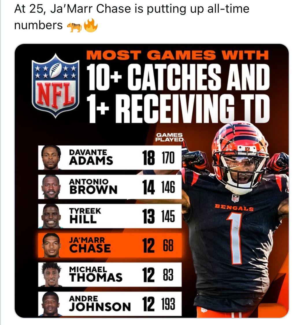 So Chase, at minimum, has 120 catches and 12 TDs in his career