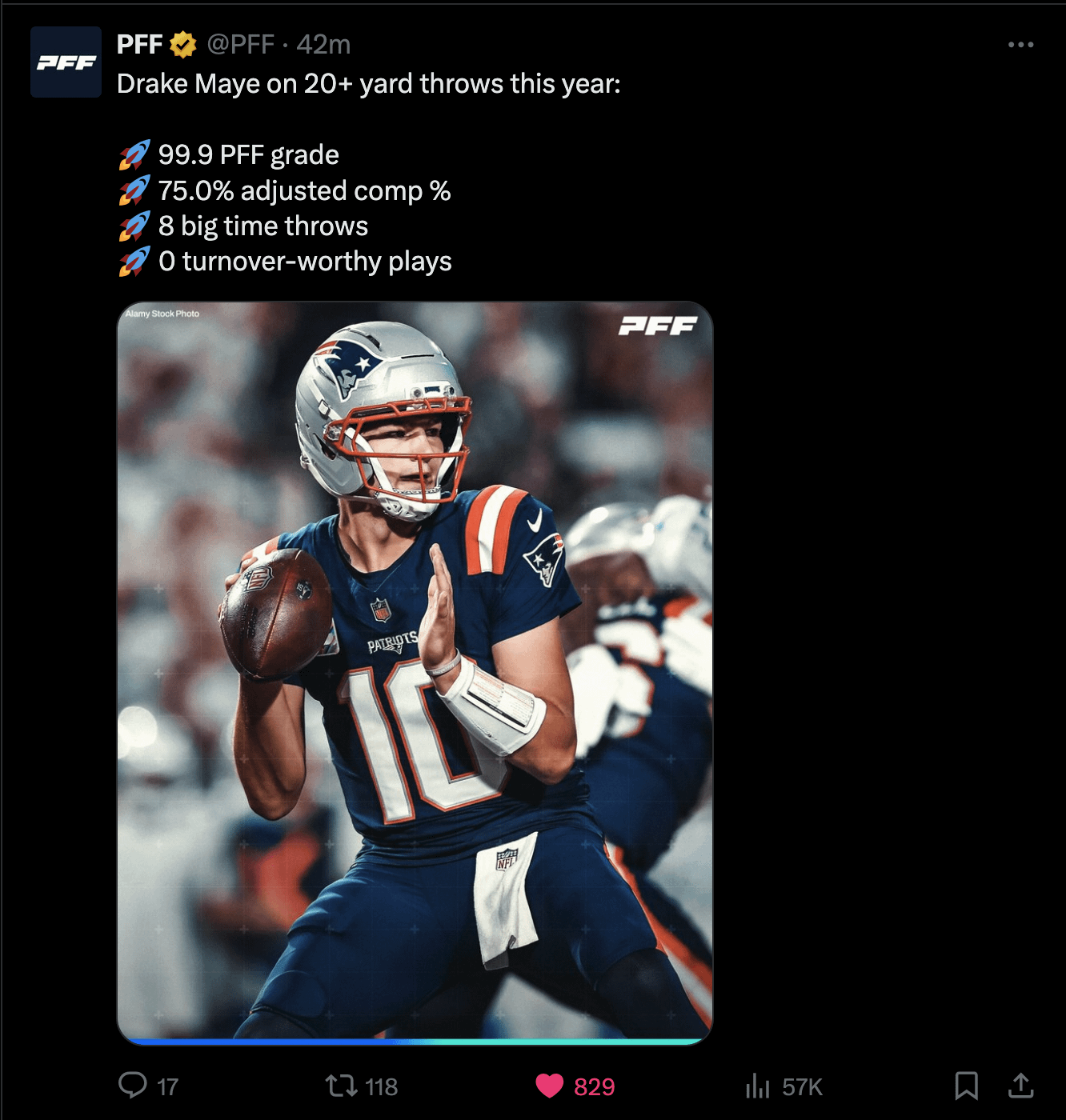Drake Maye has a 99.9 PFF grade on deep throws this season 🤯