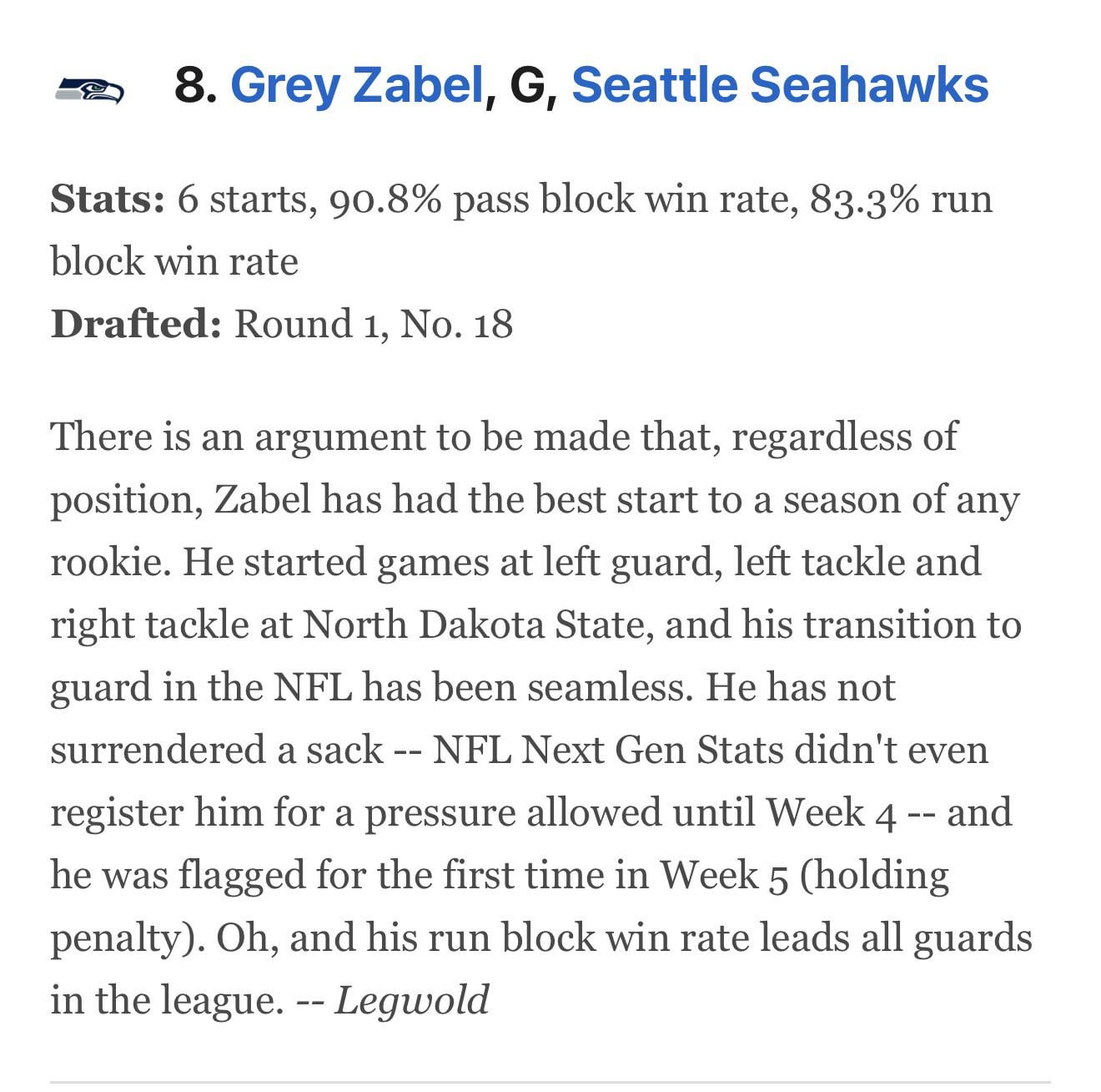 Zabel has been a significant stabilizing force in the interior of that line. The solid O-line play, particularly the pass protection, has been a huge component to the super efficient offense we’ve seen to start the year. The fact Zabel’s a stable starter immediately is hugely impressive, given interior linemen is one of the harder positions to make a short term impact as a rookie.
