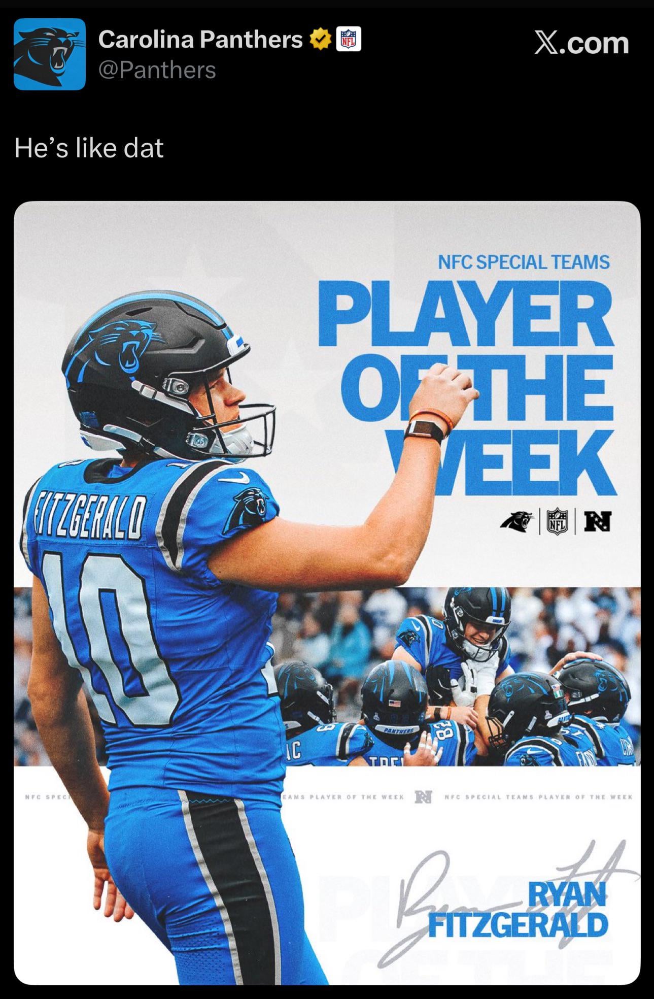 [Panthers] Ryan Fitzgerald named NFC special teams player of the week 6 comments Would have been nice if Rico got OPoW two weeks in a row, but it went to Bijan, with worse stats than Dowdle this week. i love my carolina rookies bless em What a draft class, when you include UDFAs Fitzgerald and Thornton This dude was an absolute steal as an UDFA So nice to get a rookie kicker with long term potential! Glad we don’t have to dip in the free agency kicker market every other year. His knuckleballs are game changing Leave a ReplyYou must be logged in to post a comment.