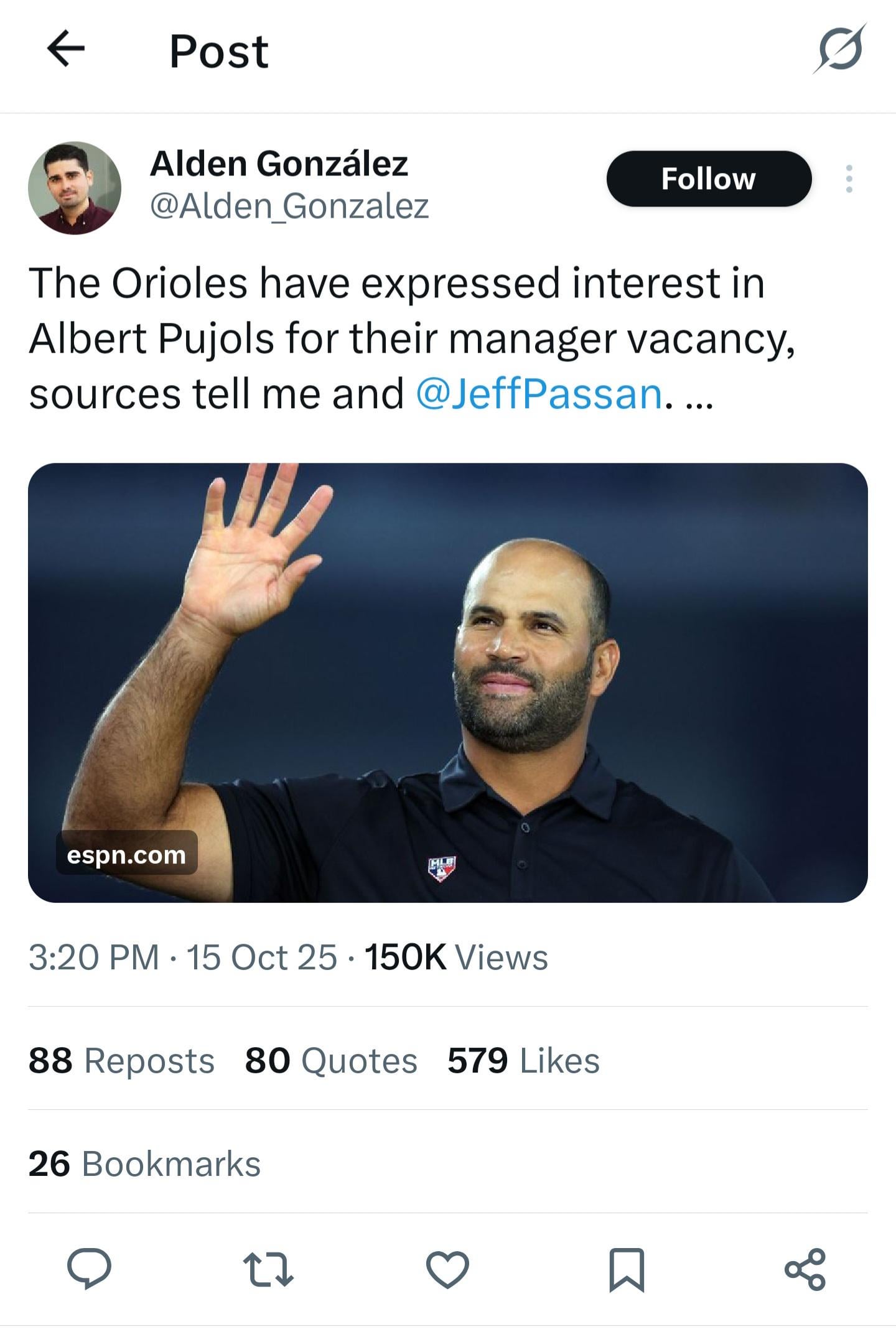 2. Im fine with Pujols going to the O’s as long as we get Torii Hunter as our manager. Those are my top 2 choices