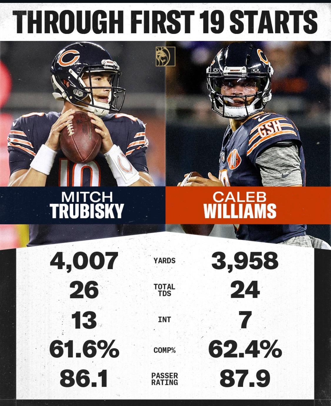 To be fair, Caleb had 6 games where he didn’t pass for more than 150 yards last year. He’s playing way better and I think it will be more meaningful to compare their first 30 or 35 games