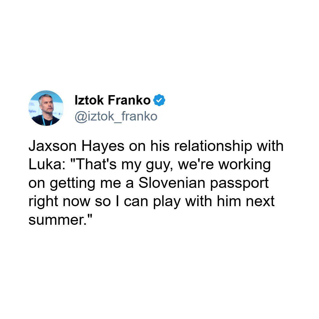 [Franko] Jaxson Hayes on his relationship with Luka: “That’s my guy, we’re working on getting me a Slovenian passport right now so I can play with him next summer.” π