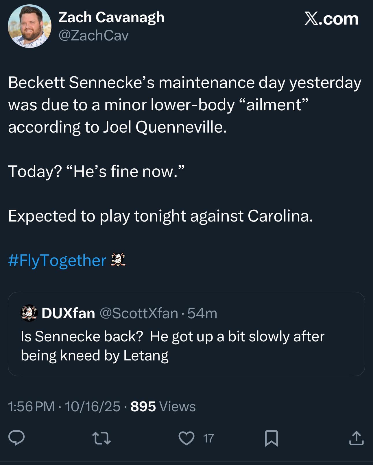 [Cavanagh] Beckett Sennecke’s maintenance day yesterday was due to a minor lower-body “ailment” according to Joel Quenneville. Today? “He’s fine now.” Expected to play tonight against Carolina.