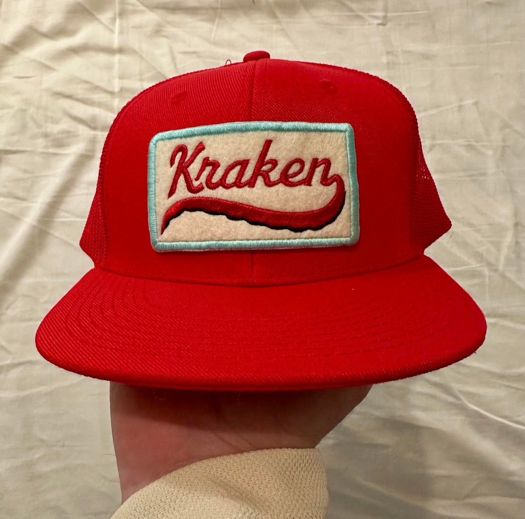 Wanted to make a hat that felt vintage like the jersey. Inspired by old beer hats and baseball tails but with a tentacle instead. Not a lot of red Kraken gear so leaned into that.