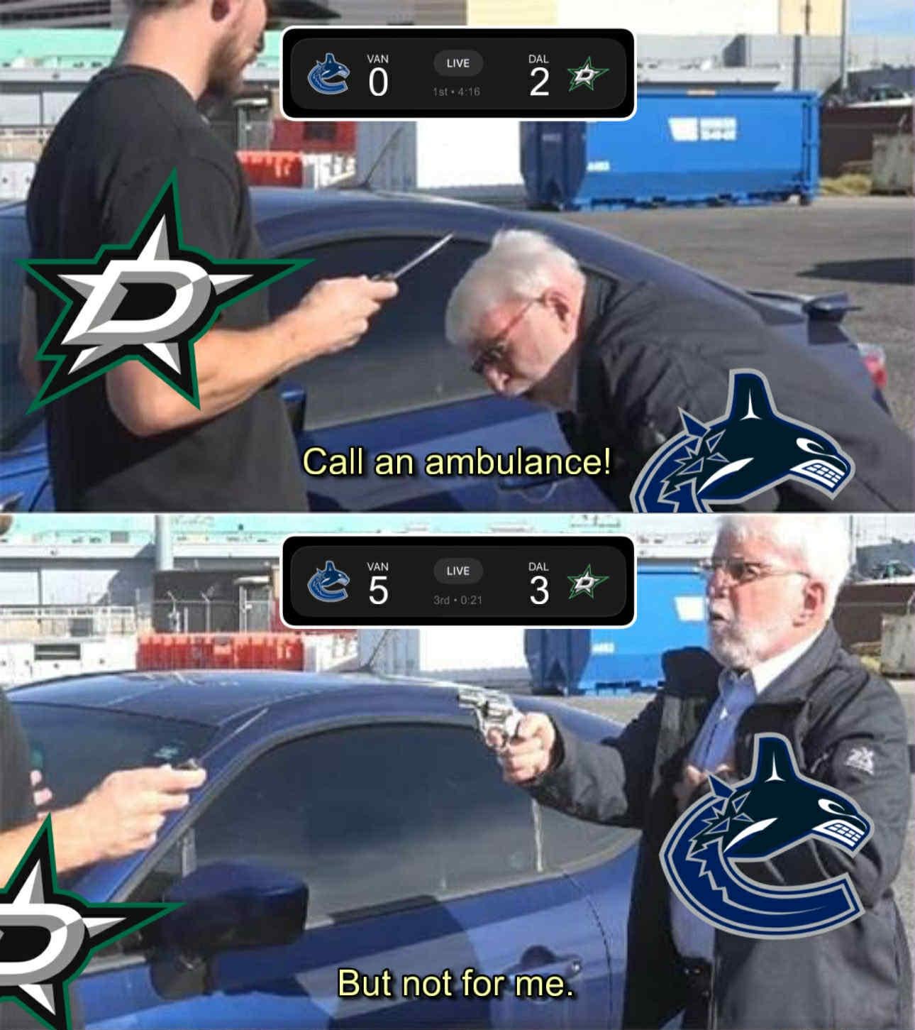 Were back? 6 comments were so back It’s amazing how they can look like the worst team in the league for one period and then look like one of the best the next. back to 0.500 baby! I think the stars really underestimated us. Took the foot off the gas. By the time they got it back together it was too late Hello we’re back department, id like to file a claim The Vancouver “Tacher “Team MVP” Demko” Canucks Leave a ReplyYou must be logged in to post a comment.