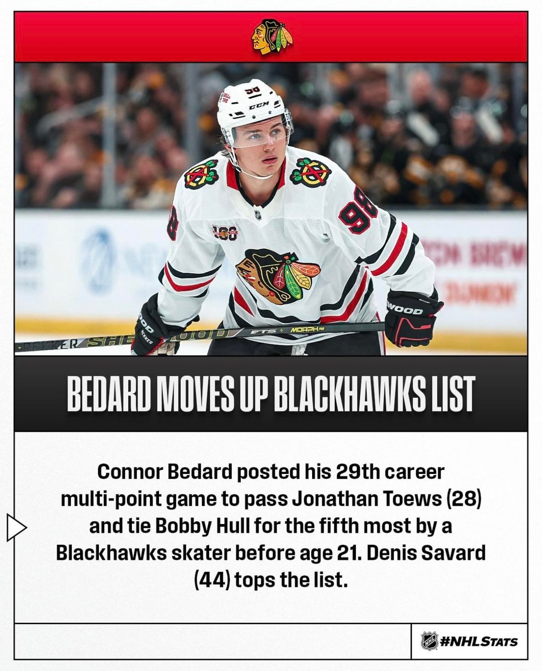 – Connor Bedard (0-2—2) posted his 29th career multi-point game to pass Jonathan Toews (28) and tie Bobby Hull for the fifth most by a Blackhawks skater before age 21. The list is led by Denis Savard (44), Jeremy Roenick (41), Eddie Olczyk (41) and Patrick Kane (39).