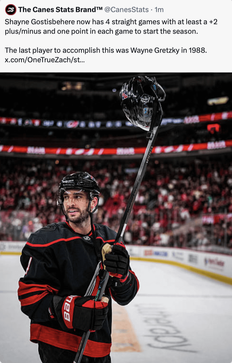 Shayne Gostisbehere now has 4 straight games with at least a +2 plus/minus and one point in each game to start the season. The last player to accomplish this was Wayne Gretzky in 1988.