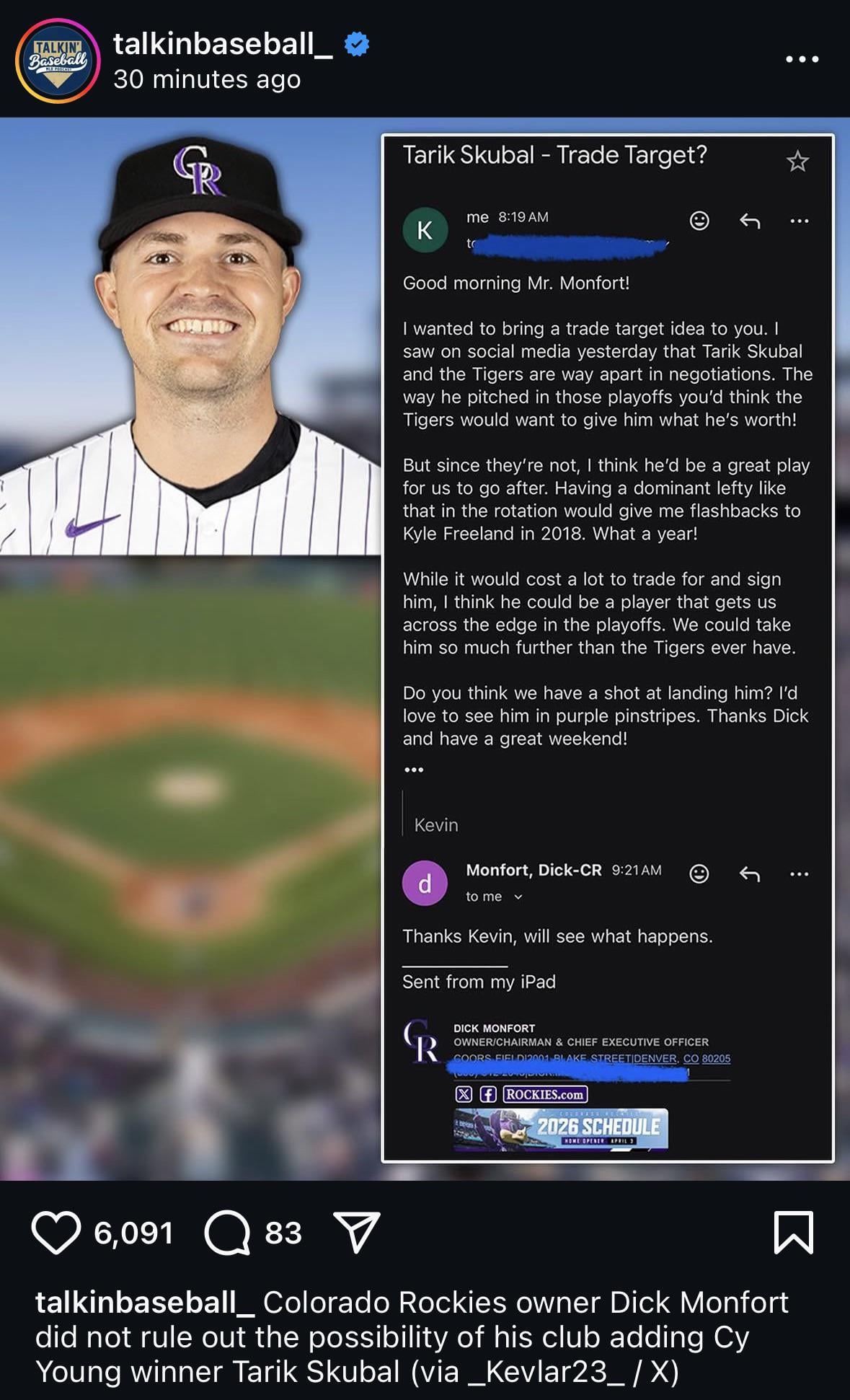 LOL. I know it’s a joke, but I would say the Rockies have less than a 0% chance of landing Skubal. So many reasons he would never come here.