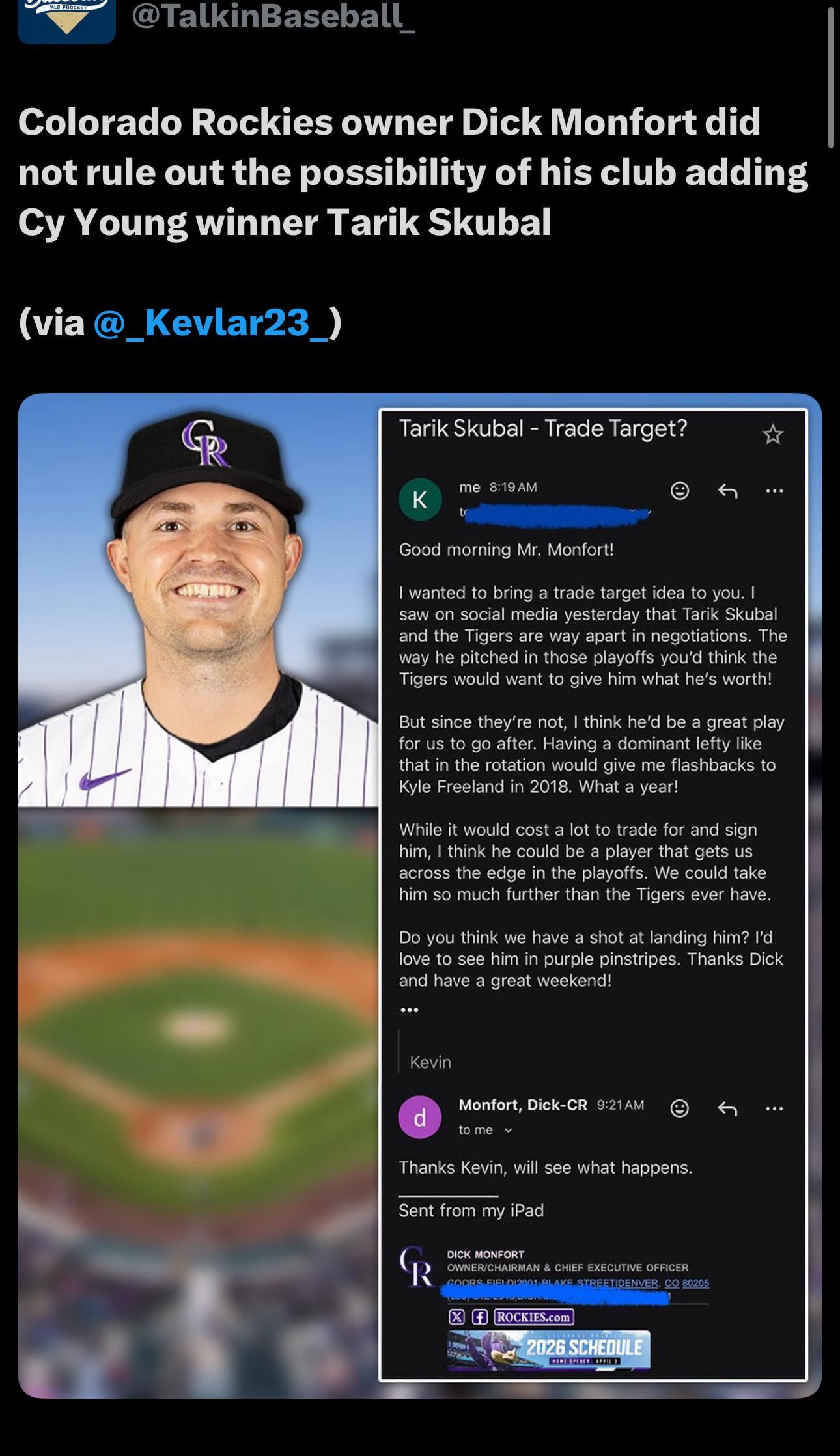 They have no one to trade, there is no fucking chance Skubal would want to pitch in Denver for any amount of money, and Monfort is a piece of shit and would never pay someone that good.