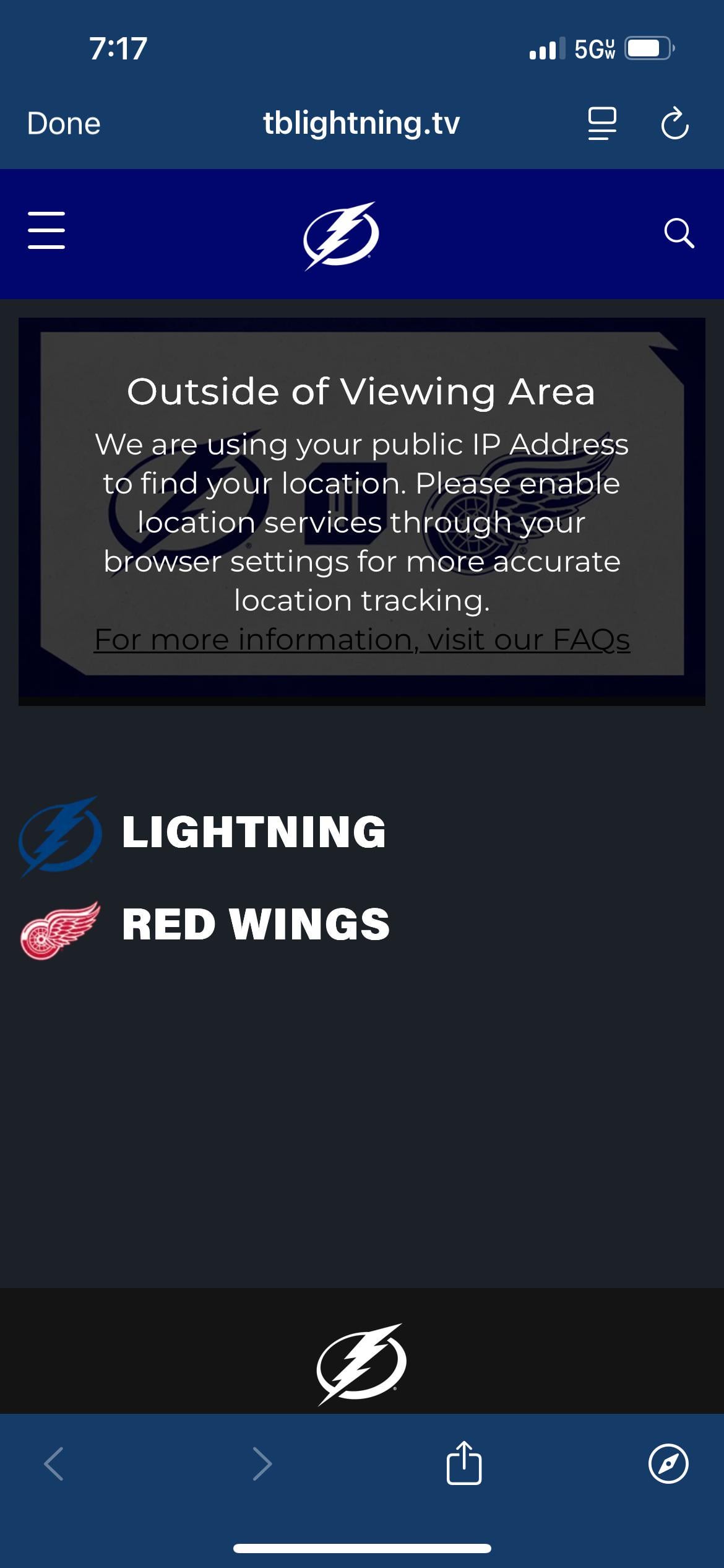 If the articles do not solve your problem, please ensure you have enabled Location Services for the Tampa Bay Lightning app in your device’s settings. You can also set or verify your home location directly on our website here: https://www.tblightning.tv/location-settings.
