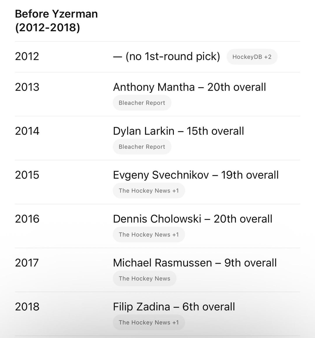 The latter part of the Ken Holland era was a gong show in so many ways. The drafting may have been the worst aspect of it. Set the team back light years. Yzerman actually inherited a pile of rubble while Kenny went swanning off trying and failing to build a champion in Edmonton, where he already had two franchise players on the roster. And he still effed up with some stupid moves, like the Nurse deal and not acquiring a legit goaltender.