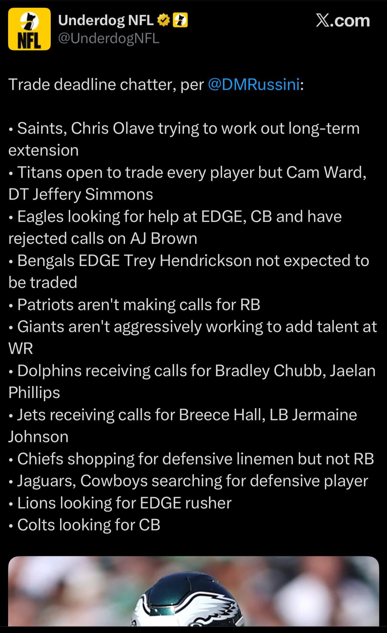 [Underdog NFL] Trade deadline chatter, per @DMRussini: • Chiefs shopping for defensive linemen but not RB