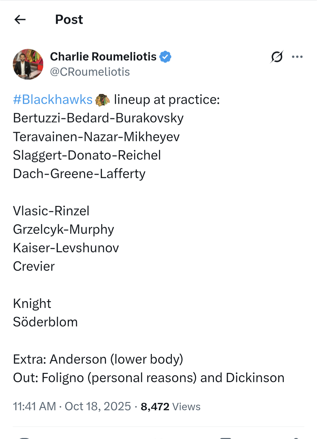 I feel that since we’ve been seeing 7 dressed dmans, Bedard is gonna pull double duty with Lafferty being the man left out.