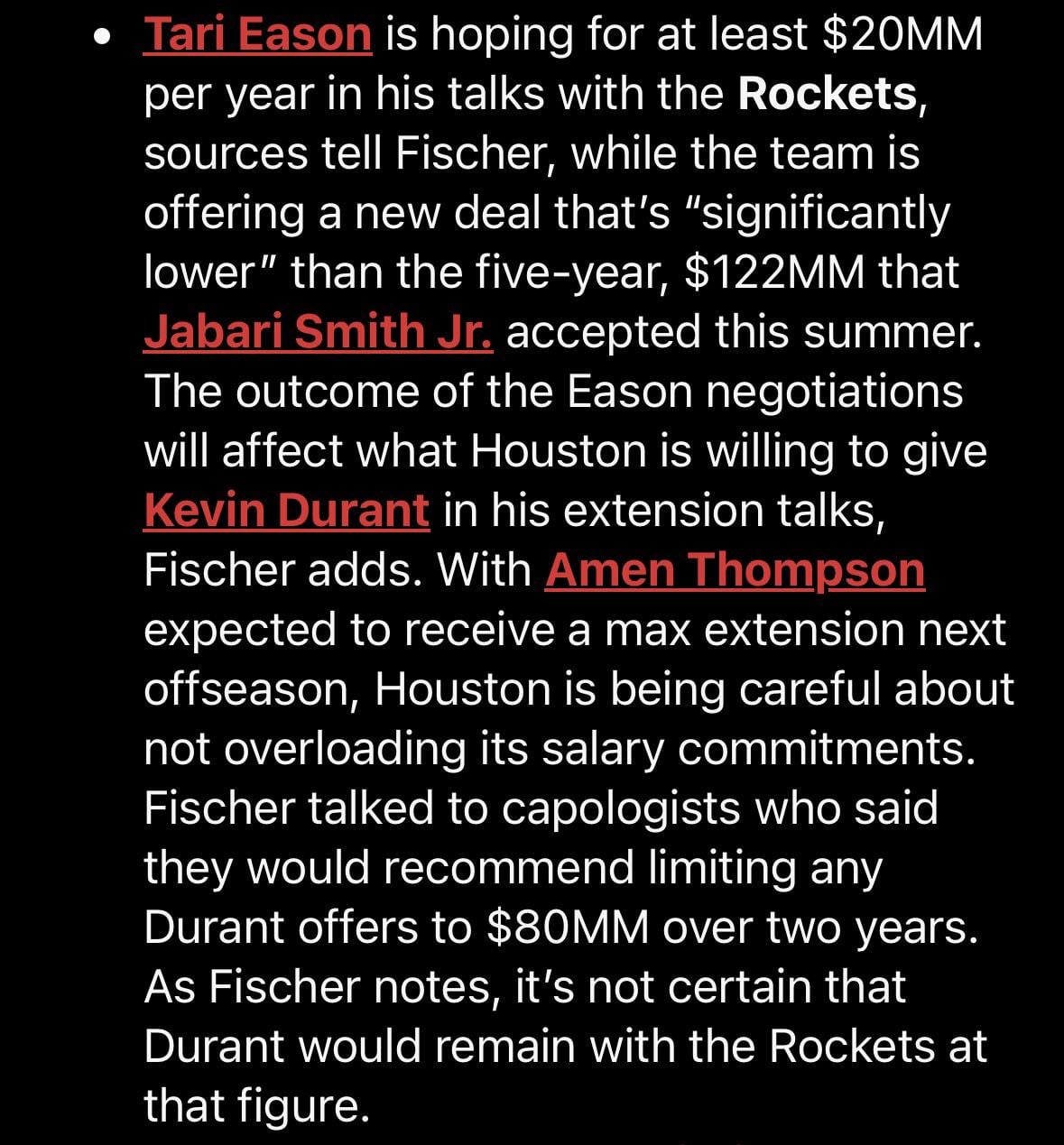 we all knew KD deal is just waiting on Tari. the fact that he’s “hoping for $20m” is a good thing, especially when NBA got stinky players like Kuminga wanting $30m. If we get him at $14-17m aav and give KD the rest of the cap then we’re in a really good spot moving forward.