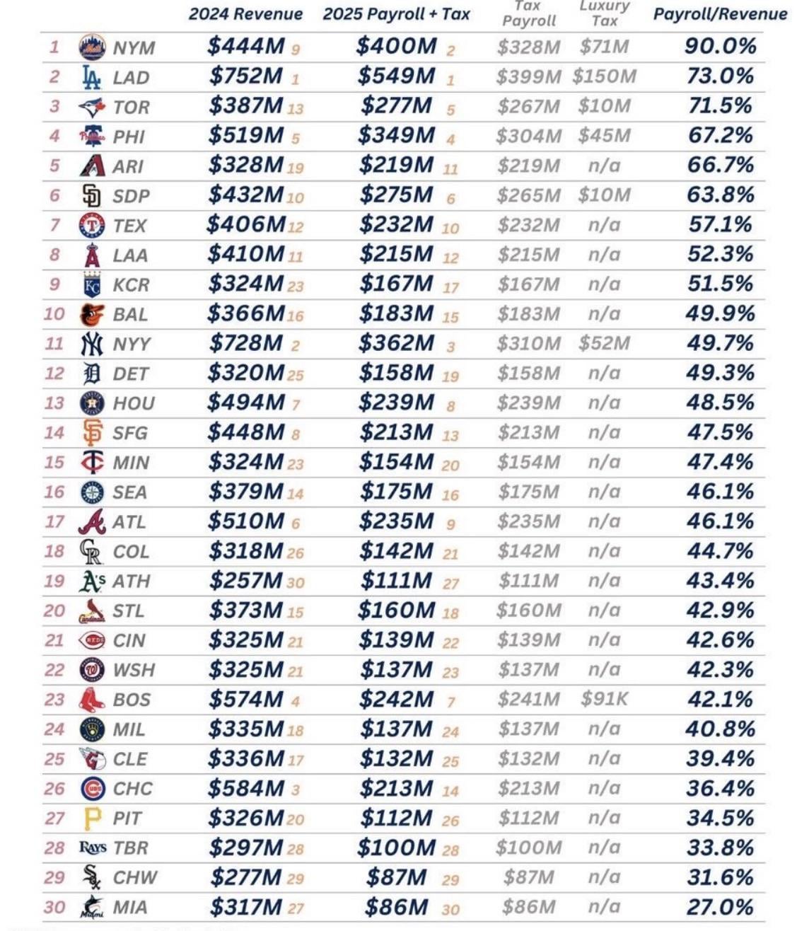 No, it’s disgraceful that there is no salary cap, that players are approaching billion dollar contracts, and that some team owners like the Pirates are only interested in net margin regardless of team win performance. It clearly can be done. Plenty of teams on there in the same revenue bracket or revenue/payroll percentage that are contenders.