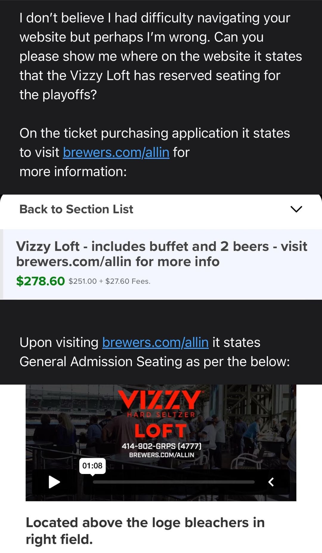 Went to Game 1 of NLCS last week – got tickets in the Vizzy Loft and was surprised when we got there and were told the tickets were Standing Room Only especially for the $300+ per ticket price. We got there early to secure bar high top seating but were told those were sold as reserved seats.
