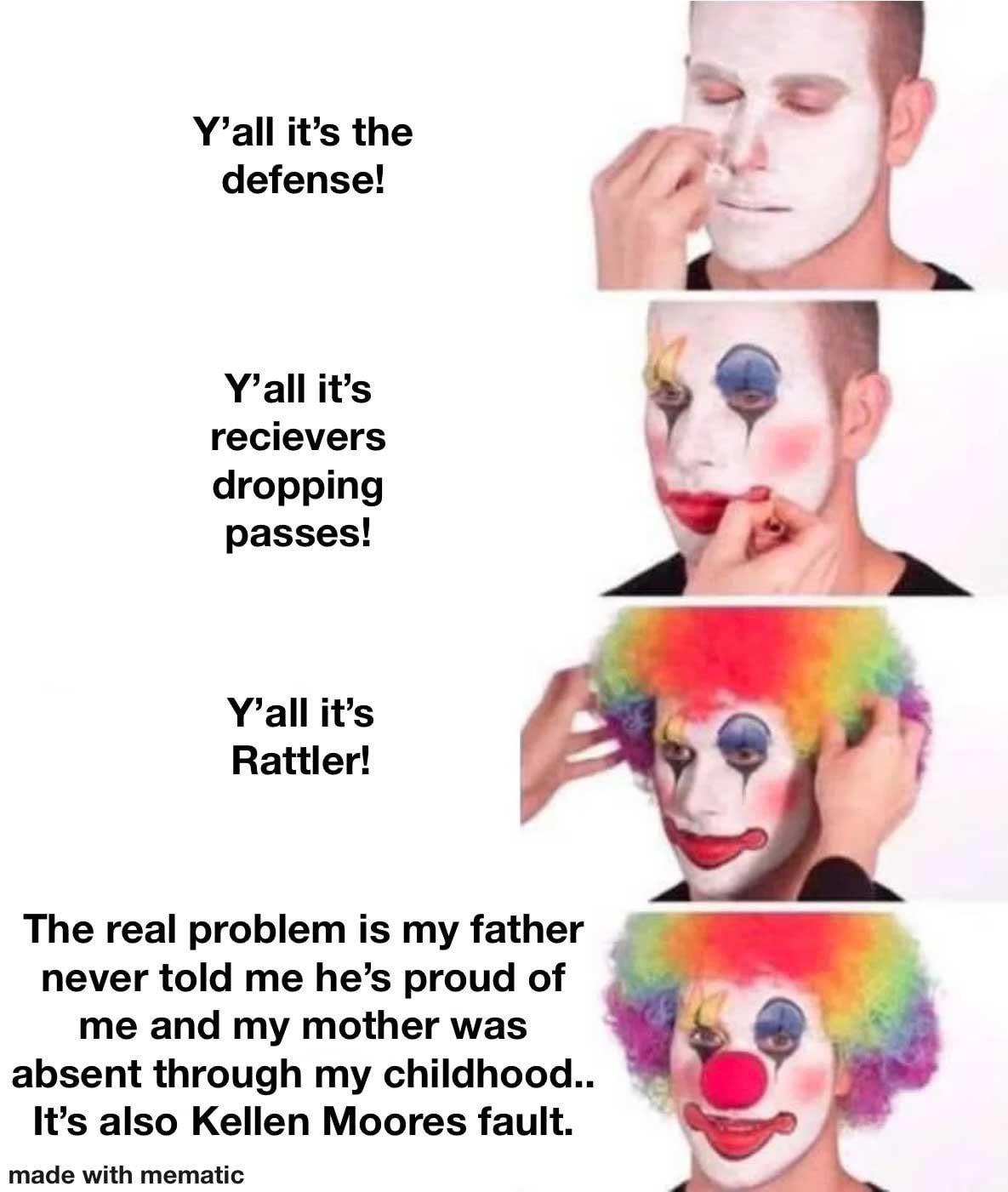 Pretty much sums it up 😂😂they act like ratt stole everything from them. The dink and doink passes , should’ve been 5 turnovers I’m over it put shough in , Moore call dumb plays , we bad , we not winning nomore , Tampa gonna run with the division , we not gonna win a division game blah blah 😂😂😂