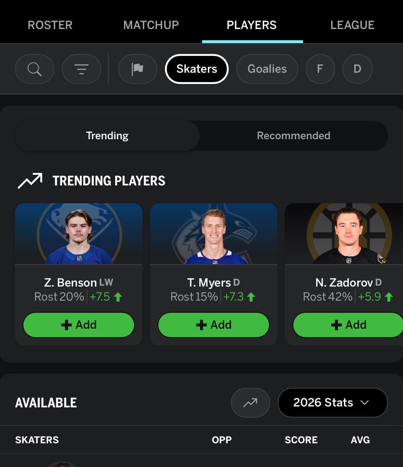 Zach Benson has in the last 10 games in fantasy hockey 4 comments The future of the Sabres on the left. The ghosts of Sabre last, on the right. Other 2 players in pic are ex-Sabres…. the tide is turning… God help me, I’ve got Benson, UPL and Lyon on my fantasy team. I believe in this team, even when I know I shouldn’t. I love that perpetuating this is memorializing it through the algorithmification of everything Leave a ReplyYou must be logged in to post a comment.