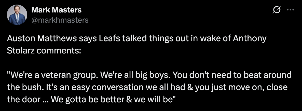 [Masters] Auston Matthews says Leafs talked things out in wake of Anthony Stolarz comments: “We’re a veteran group. We’re all big boys. You don’t need to beat around the bush. It’s an easy conversation we all had and you just move on, close the door … We gotta be better and we will be.”
