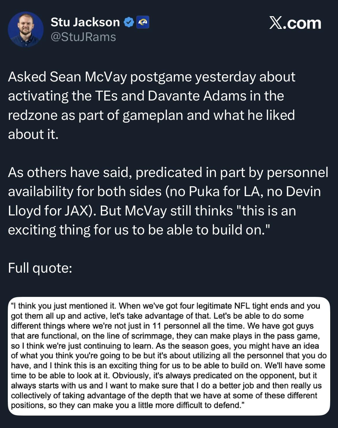 This is what I’ve been waiting for! Confirmation that it isn’t just because Puka was out but this (multiple TE sets) has been something McVay has wanted to use but never really had the personnel for it, until now