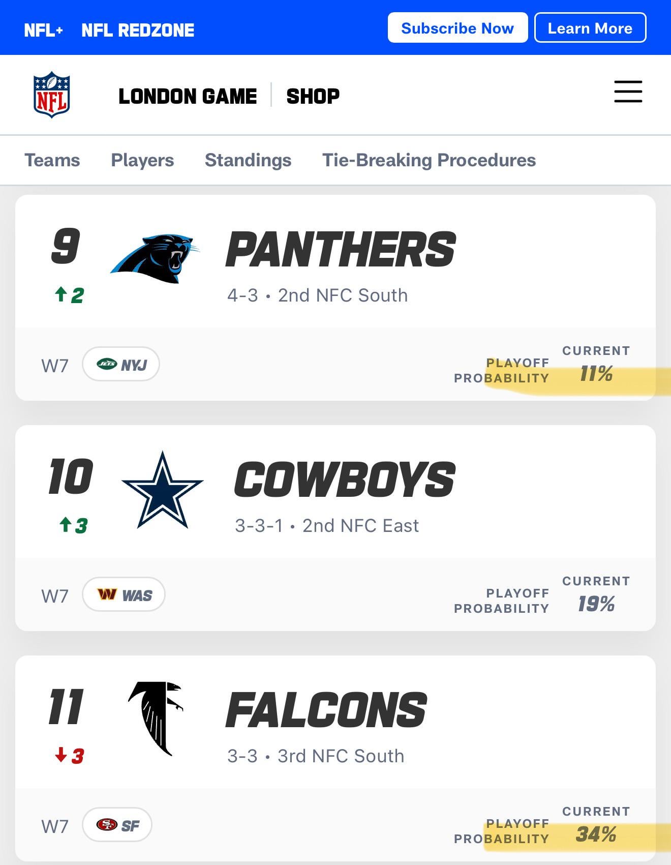 Starting QB is out with injury (high ankle sprains are notoriously nagging, unpredictable injuries), recent history is unfavorable for us sustaining success, and they’re prognosticating based off of the remaining schedule. I don’t know what their algorithm is to calculate that percentage but there are several factors that don’t bode well for the Panthers. Hopefully the players and coaches are able to overcome those factors but I really don’t see this as some type of slight or disrespect, we just haven’t been good for a long time and not don’t have our starting QB.