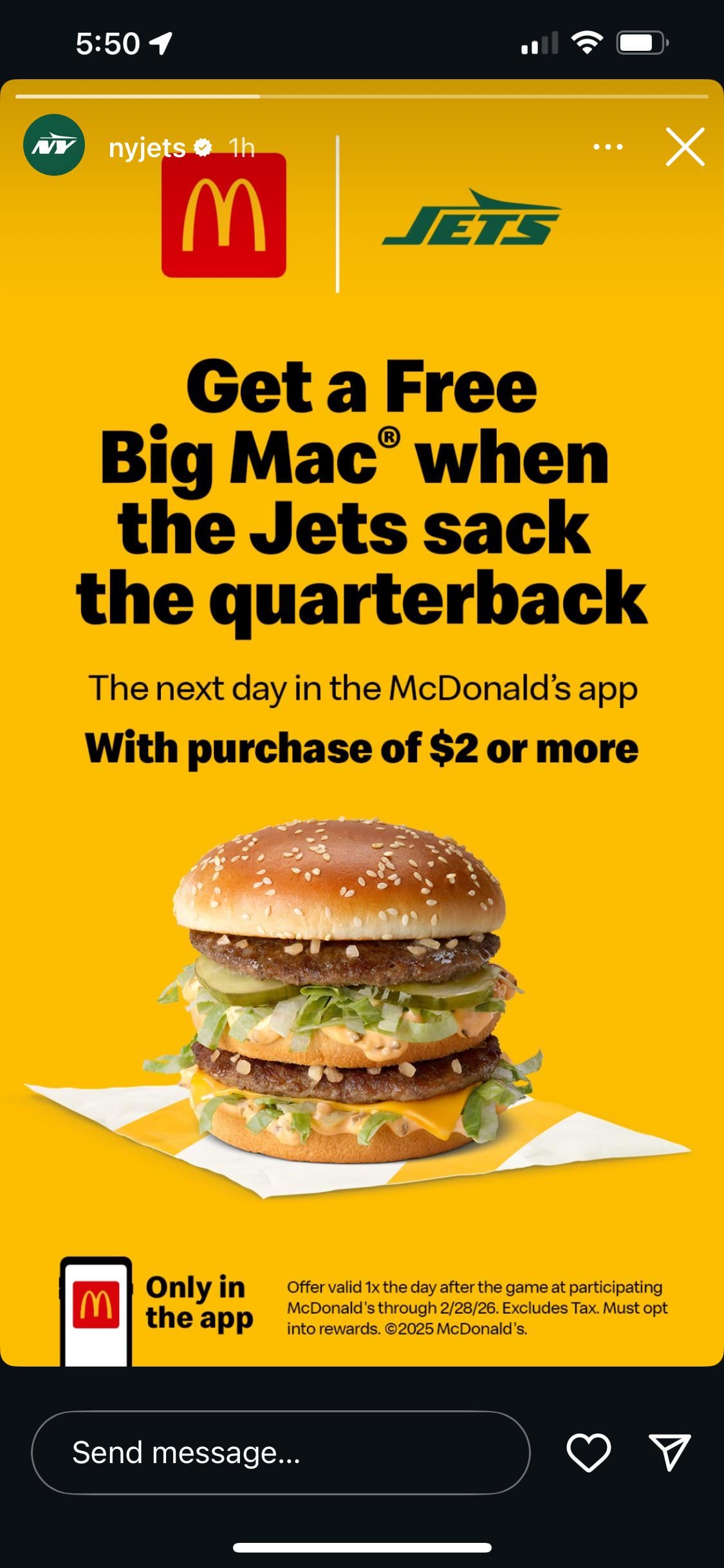 Only six more hours 9 comments Quinnen and Will McDonald evidently have stock in McDonalds, zero sacks for the two of them in the last 6 games. Is this only in ny/nj I don’t wanna eat If they did it for every time we got sacked they’d go out of business. I love how if this were any other team in America it would be a promo if they win. Have to lower the standards for the Jets I first read it as “when Jets Qb gets sacked” and pulled up fidelity to short MCD. Only good thing the Jets do each week. And there’s been a few weeks where they didn’t even get a sack. At this point. they could probably get away with “all you can eat for free – if the jets win a game” By “sacked” do they mean benched/fired/cut like the British say? If so, maybe so! Leave a ReplyYou must be logged in to post a comment.