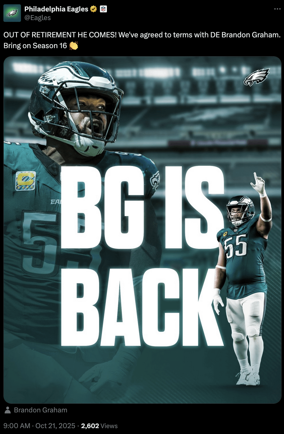 [Eagles] OUT OF RETIREMENT HE COMES! We’ve agreed to terms with DE Brandon Graham. Bring on Season 16 👏