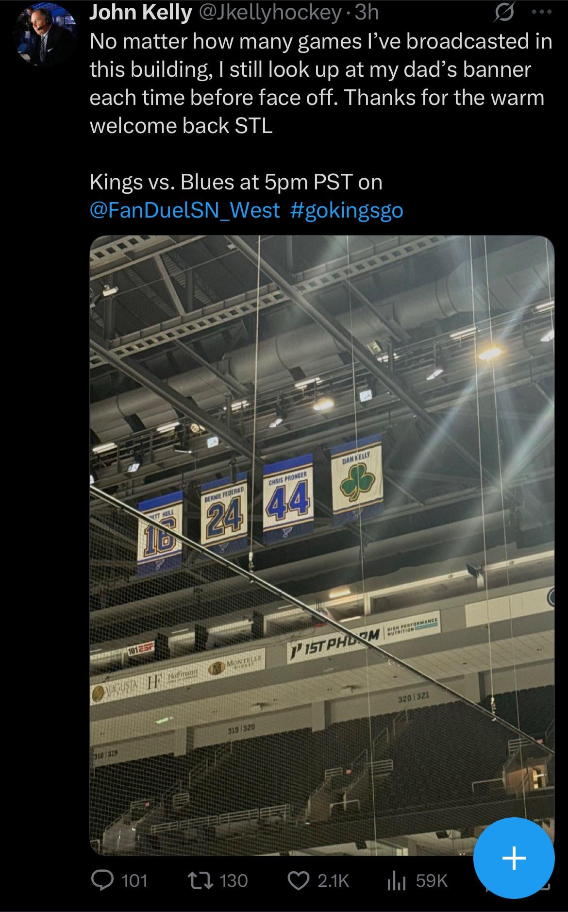 [John Kelly] No matter how many games I’ve broadcasted in this building, I still look up at my dad’s banner each time before face off. Thanks for the warm welcome back STL.