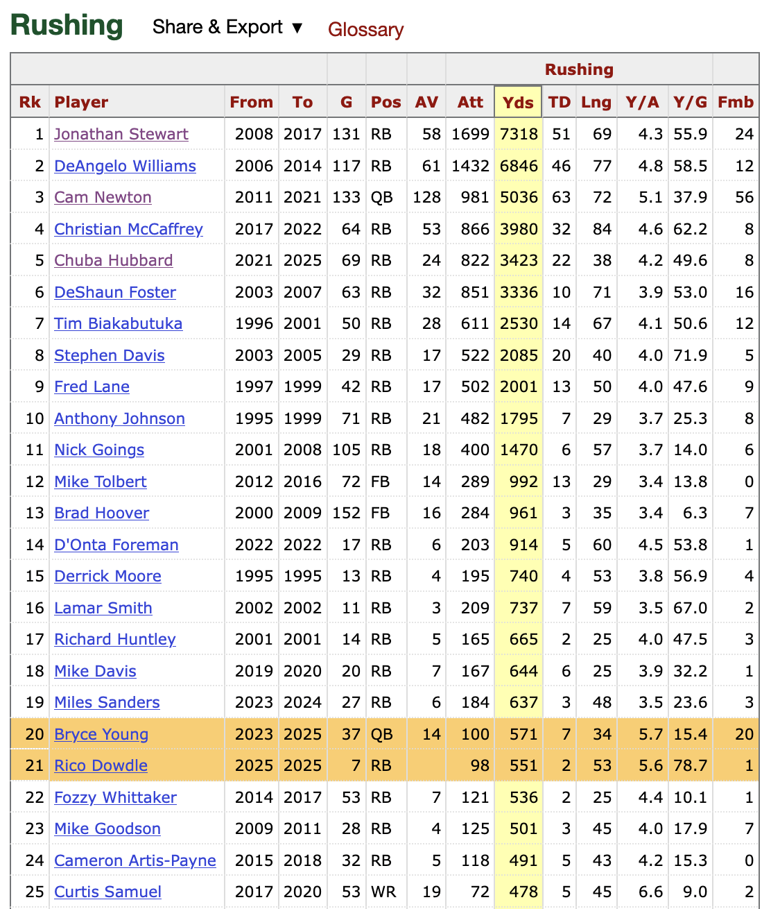 Source – https://www.pro-football-reference.com/teams/car/career-rushing.htm