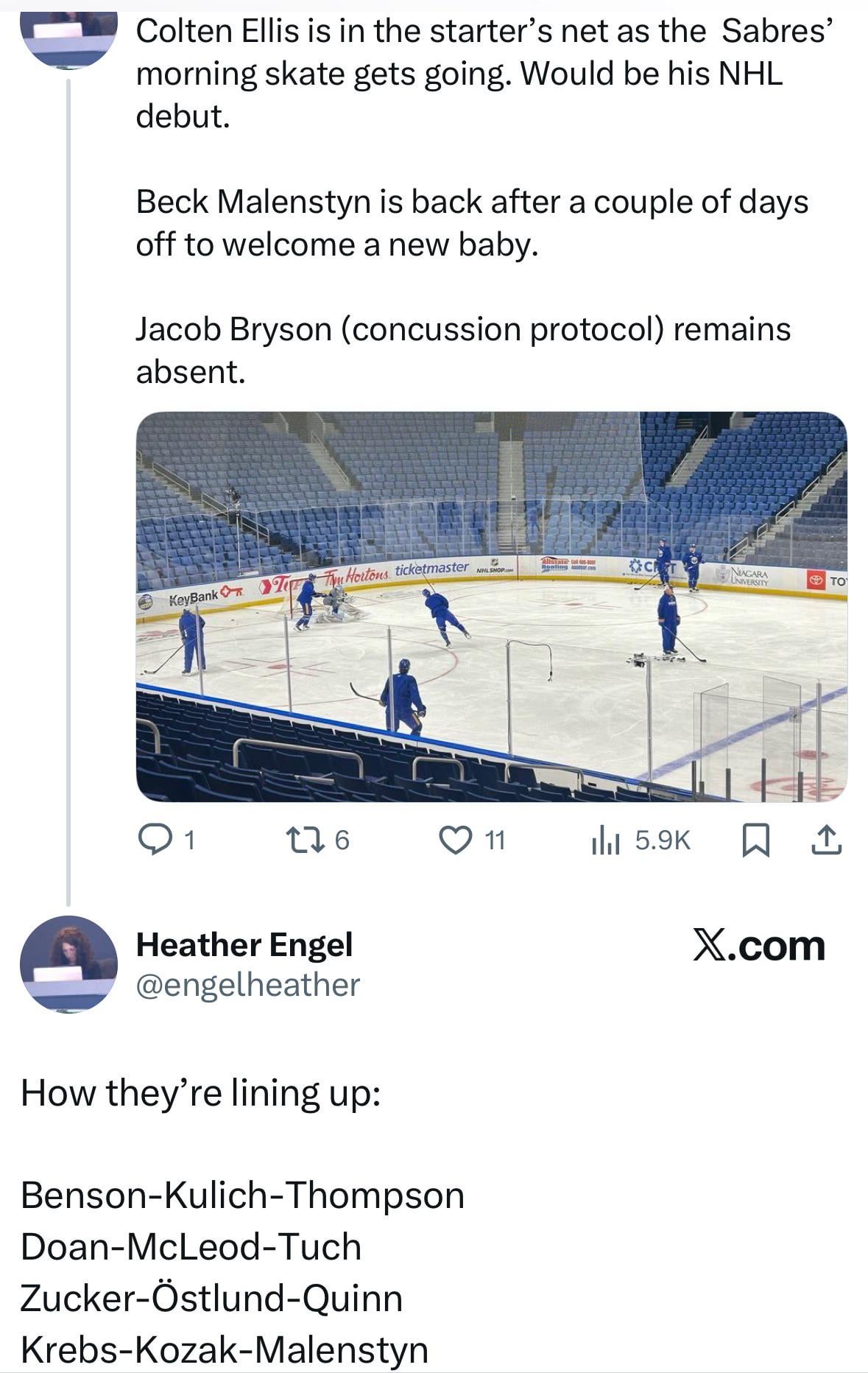 [Engel] Ellis in starter’s net, Ostlund in at 3C. Krebs and Malenstyn on the 4th line for Geersten and Dunne.