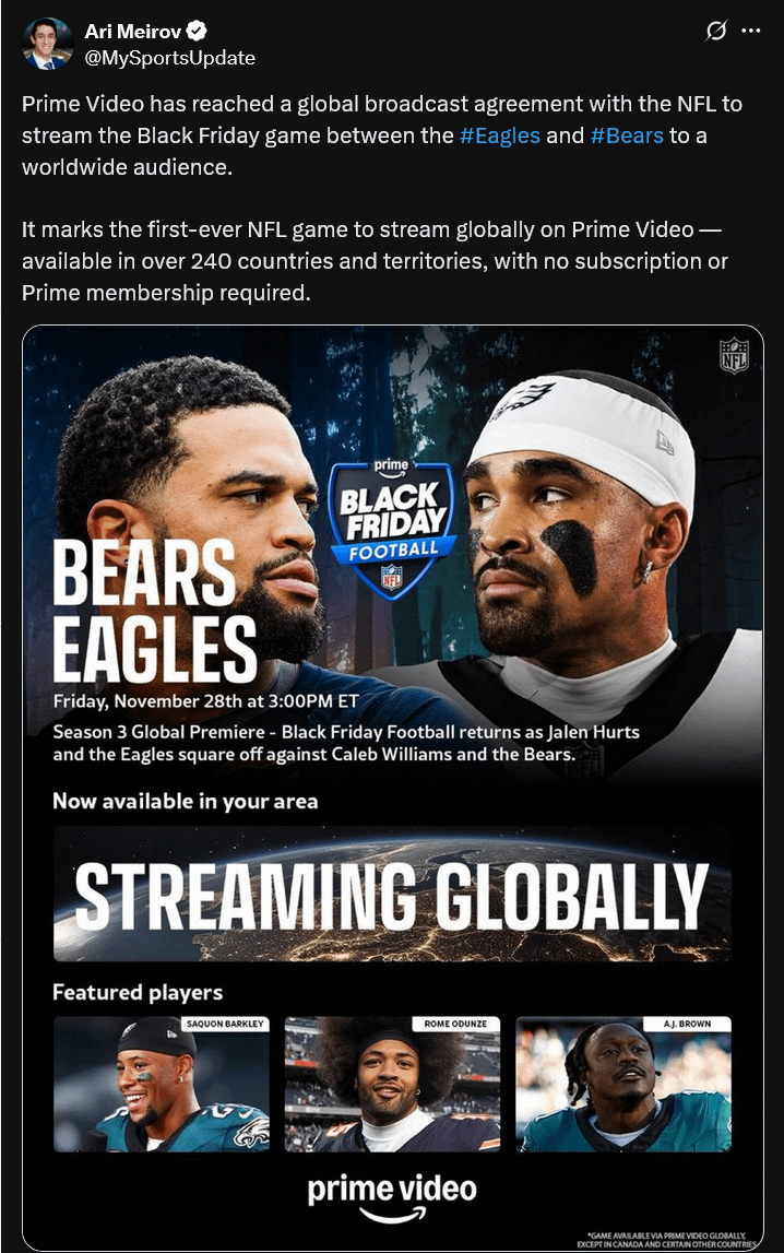[Meirov] The Bears will compete on a global stage on Black Friday thru Prime Video