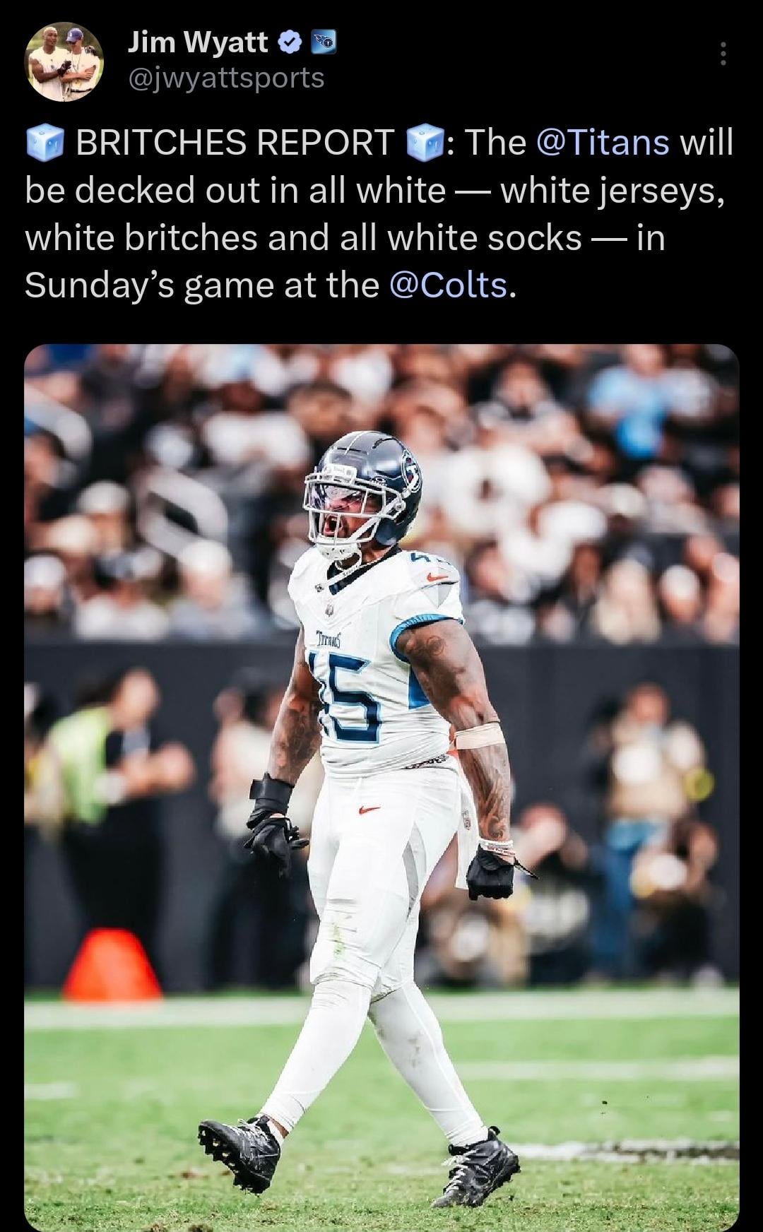 🧊 BRITCHES REPORT 🧊: The Titans will be decked out in all white — white jerseys, white britches and all white socks — in Sunday’s game at the Colts.