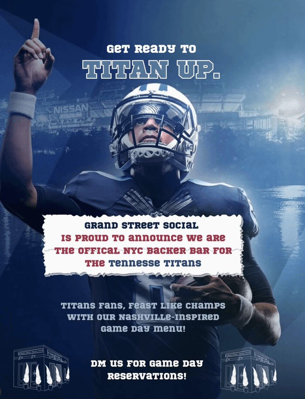 Hi Everyone, if you're in NYC and have been wanting a place to watch the Titans, now there is! Grand Street Social just became the offical backer bar for the titans in new york. They have a Titan's tailgate menu filled with drink specials and Nashville food favs. We are trying to get a fan club growing here to reach out if you're local or visiting soon, and are interested!