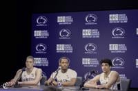 Forward Saša Ciani (22), left, guard Kayden Mingo (4), middle, and guard Melih Tunca (9), right, speak at a press conference in the Bryce Jordan Center on Wednesday, Oct. 15, 2025 in University Park, Pa.