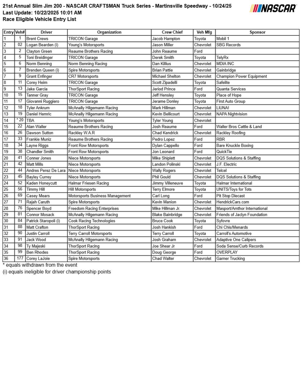 2025 NCTS Slim Jim 200 at Martinsville Speedway – Race #24 Entry List (Preliminary)