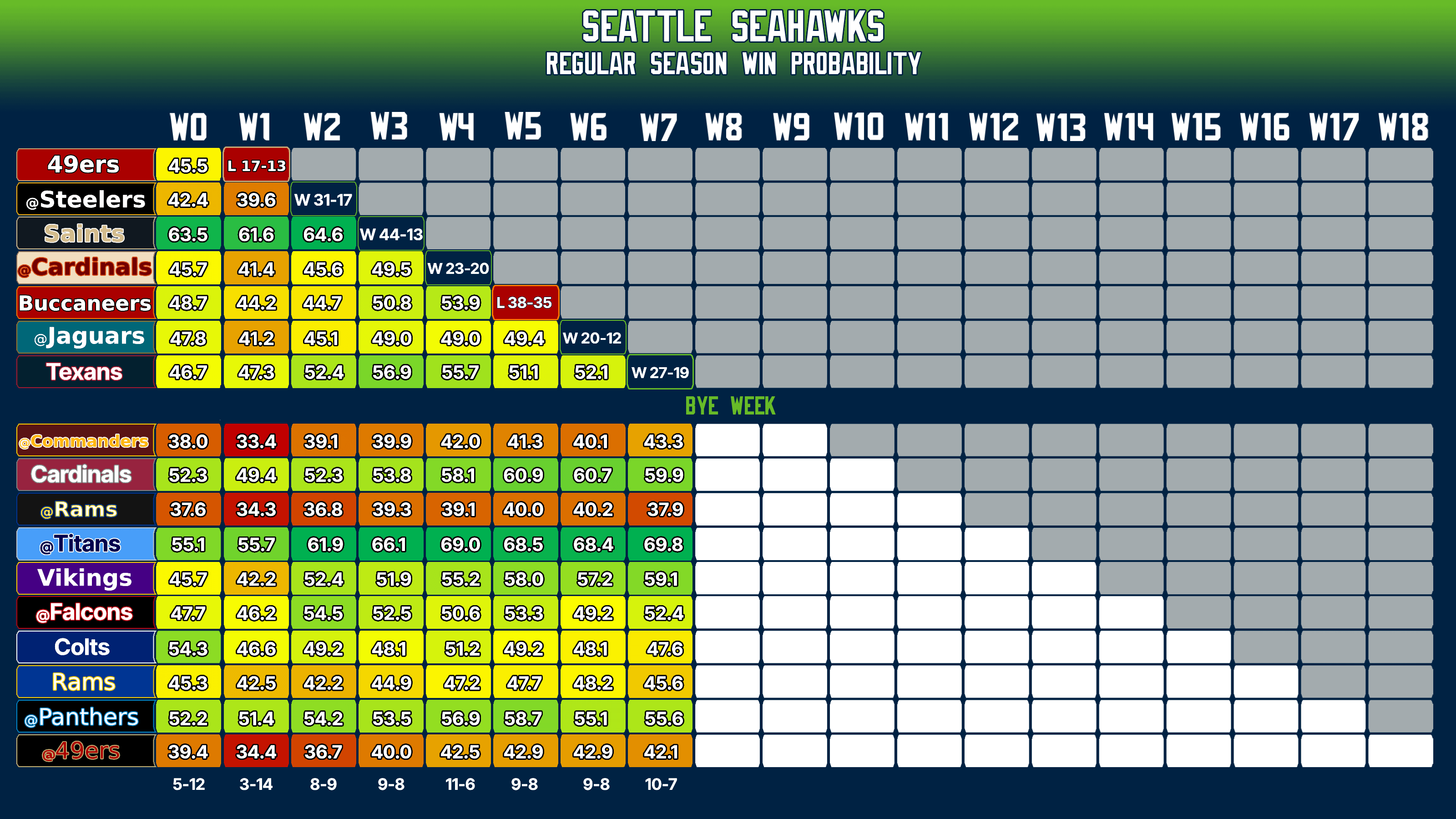 - This is a weekly heat map that tracks the Seahawks chances of winning each game during the season. The numbers represent the ESPN FPI’s win percentage.