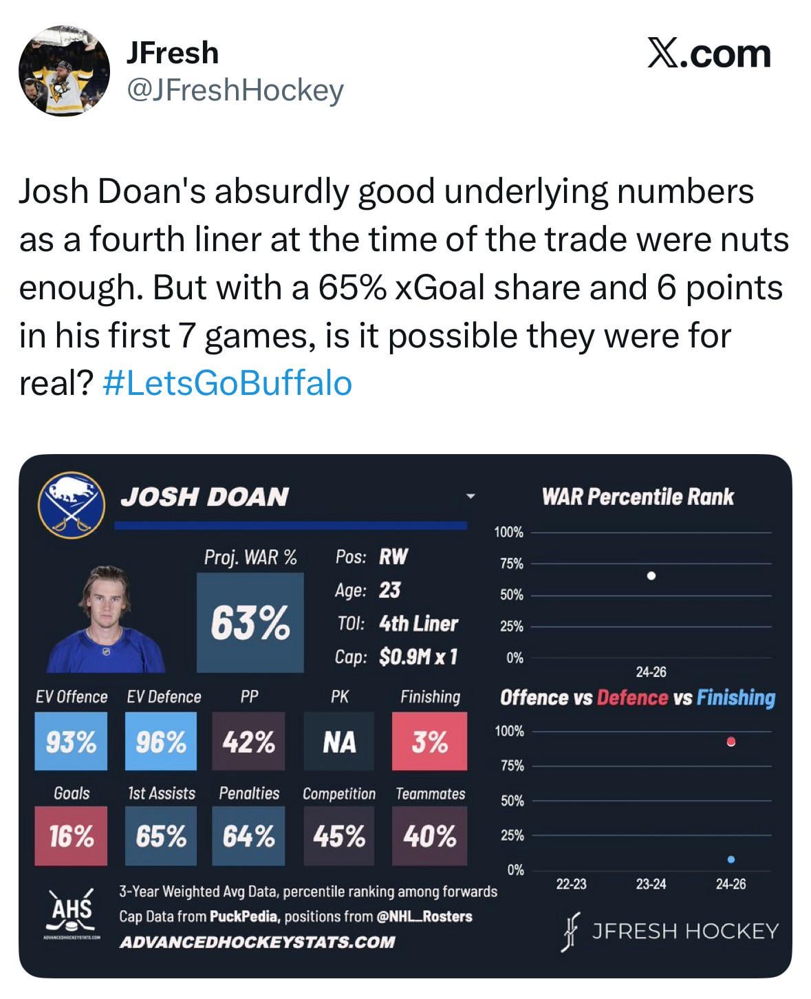 [JFresh] Josh Doan’s absurdly good underlying numbers as a fourth liner at the time of the trade were nuts enough. But with a 65% xGoal share and 6 points in his first 7 games, is it possible they were for real?