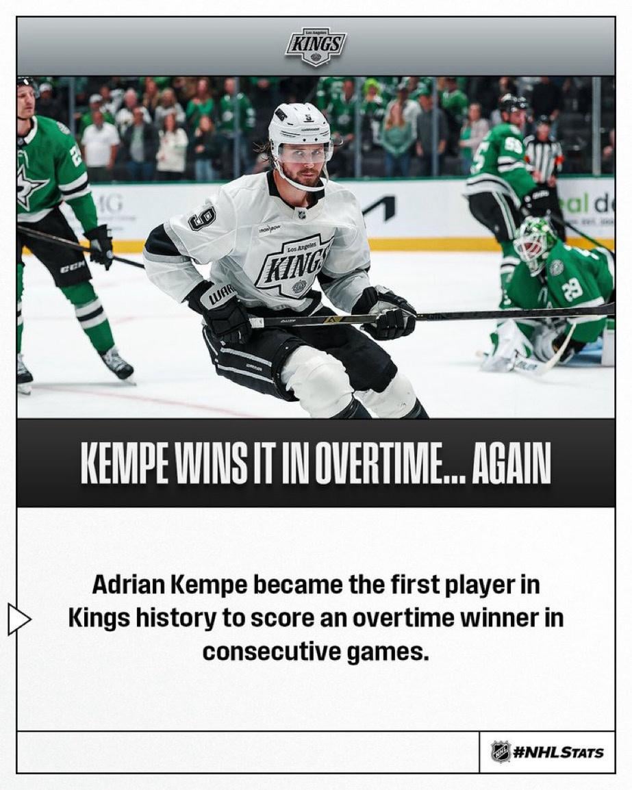Kempe became the first Kings player in their 58 year history to score OT winners in consecutive games