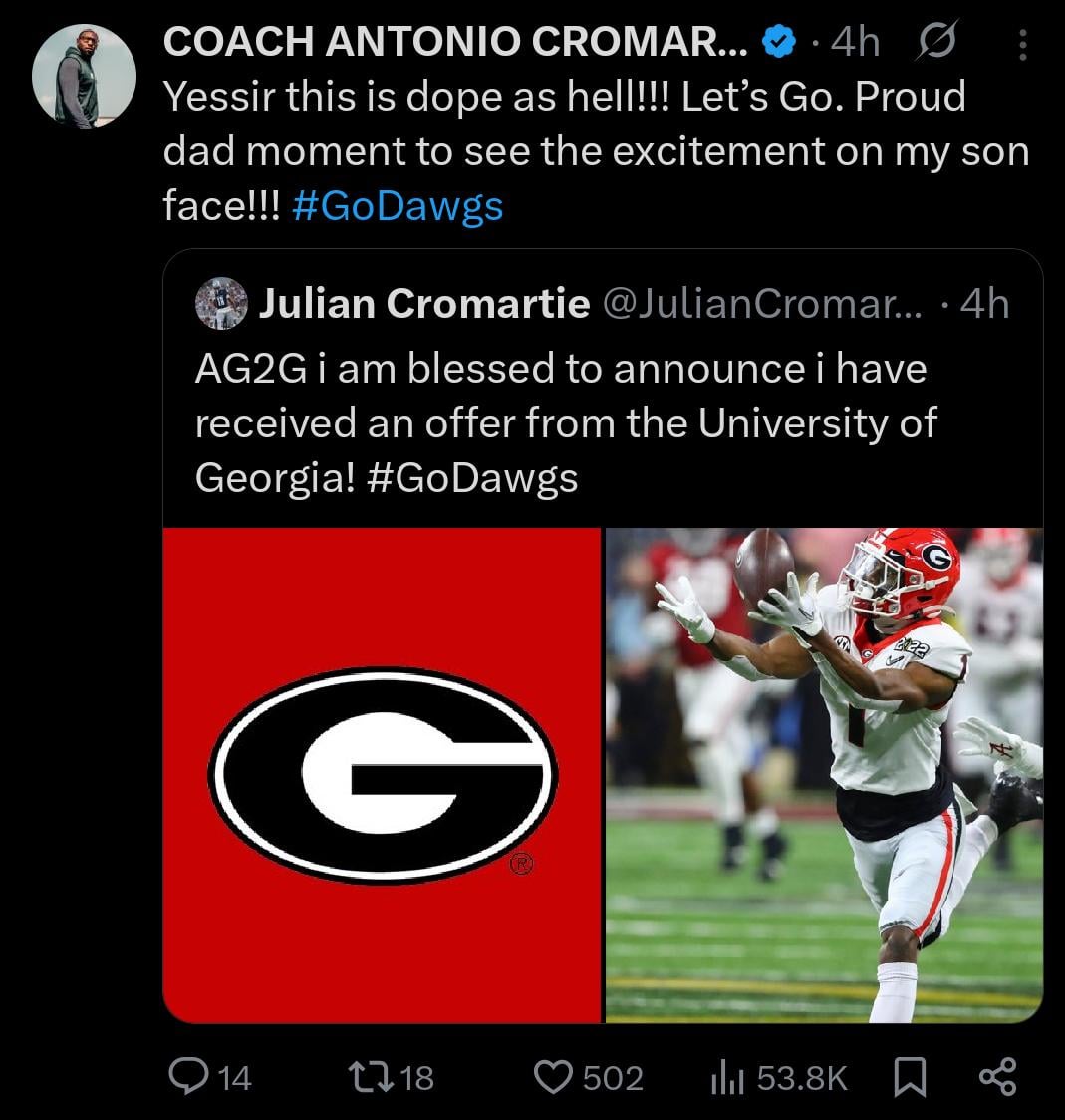 And so it begins….. 7 comments The first of many I imagine He already has 5 kids It’s funny how nepotism sports are glorified, yet nepotism in the entertainment industry is frowned upon hmmm So… Future eagles player? Howie loves his Georgia players 1 down. 12 more to come. One of his sons (Jr.) is already playing for FSU lol 20 years of constant Rivers and Cromartie clan news incoming Leave a ReplyYou must be logged in to post a comment.