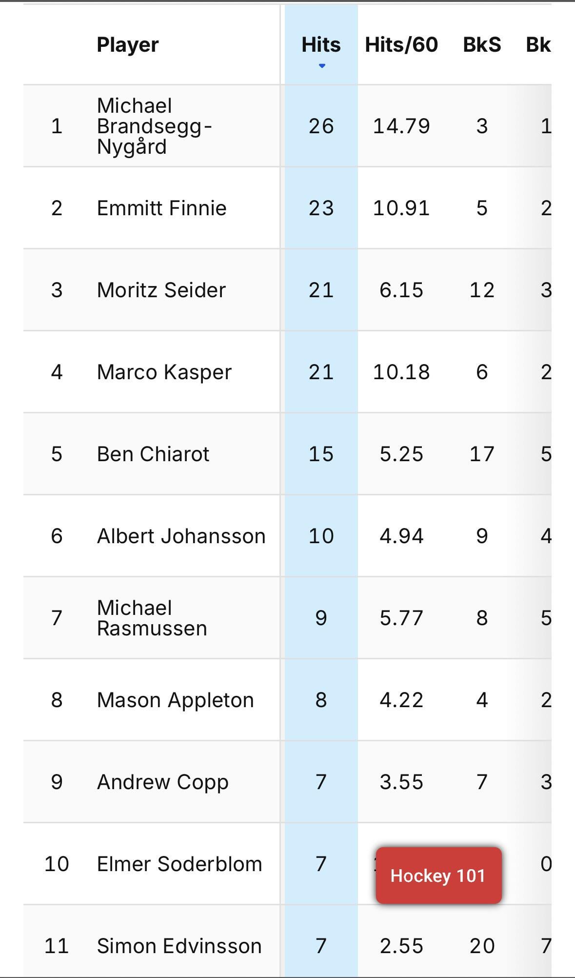Soderblom, Rasmussen, Chiarot, Edvinsson should all be at the top of this list… the only one with size keeping up with two rookies and a sophomore is Mo and even he needs to step it up based on his hits per 60